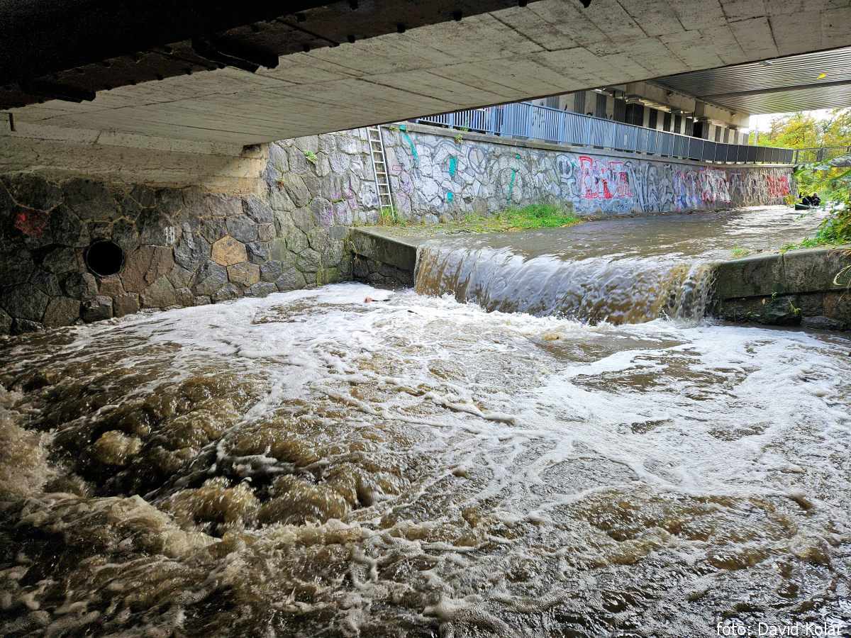 začátek regulovaného bet. koryta jez (stupeň) vysoký (m) 0.5 most cestný Jižní spojka 0,1 km |
