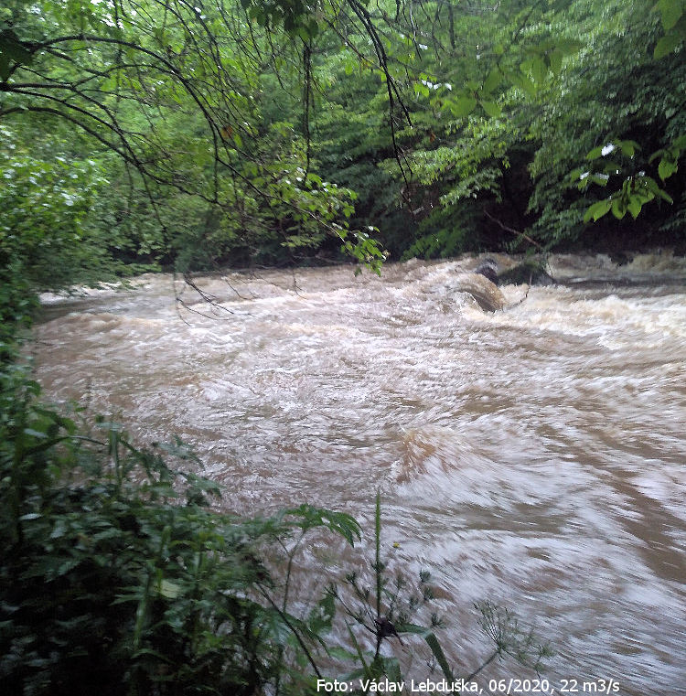 přistát vľavo, před zatáčkou doleva, nájezd do soutěsky koryta. Řeka vtéká mezi skalní bloky a přes kameny padá do cca 2 m úzkého místa se spádem cca 5 m, poslední stupeň je podle vody vysoký cca 1,5 m, dole laguna. Za opt. vody sjazdné - prohlédnout !! Jistit je lepší z pravého břehu, celé lze přenést vlevo po červené značce. Nebezpečí zaklínění a padlého stromu !! Po 30 m hned další sklaní stupeň vysoký (m) 2,0 sjazdné vpravo, !! kámen pod vodou vlevo – prohlédnout. Následuje řada balvanitých stupňů s možnými stromy v průjezdech !! celé WW IV !! Lze přenést vľavo, po červené značce až k lávce. 0,6 km |