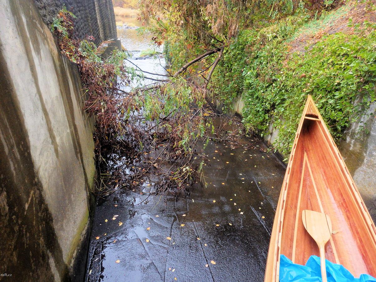 r.km 79,5 Jez Turnov má na pravé straně rybí přechod, po roštech nad ním lze přenést loď, 11/2023
