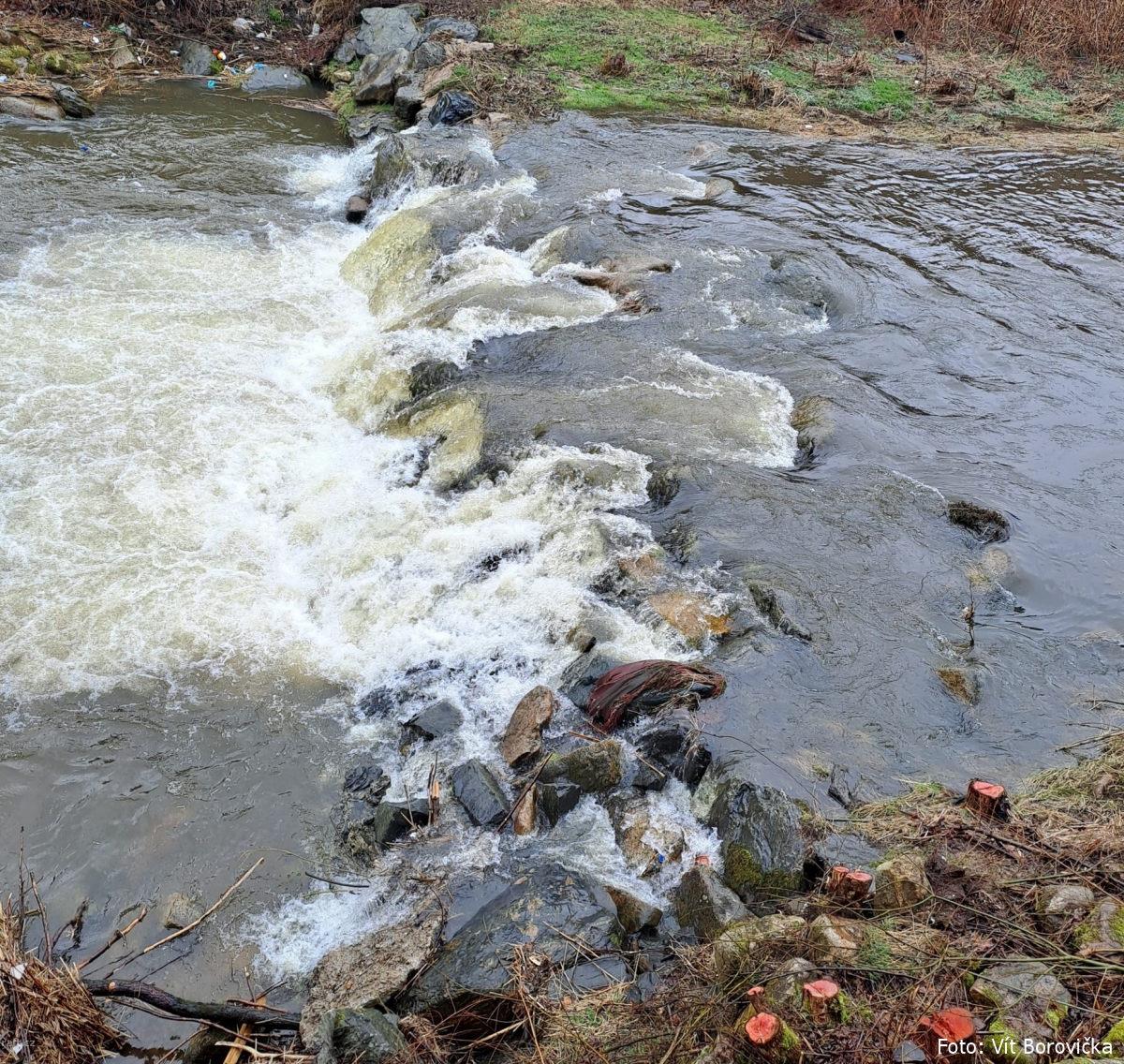20.2.2023 Držkovské skoky, strom přes řeku 50m nad peřejemi v úrovni hladiny, za vetší vody jde pžez ...