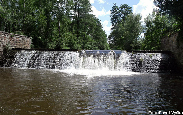 vysoký (m) 1.1 náhon vľavo, sjazdné (pozor - podlemletá břehová zeď, voda teče okolo jezu) 0,2 km (GPS: 49.805158691,13.507175446) |