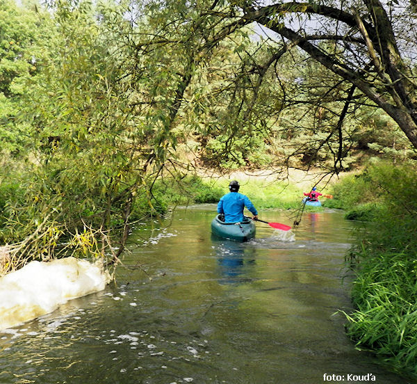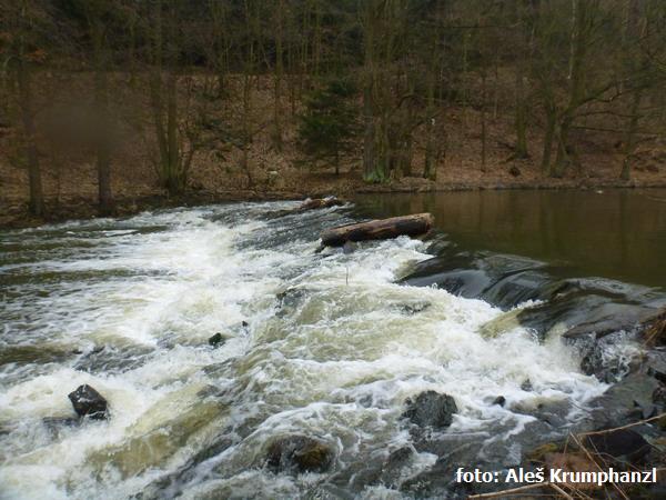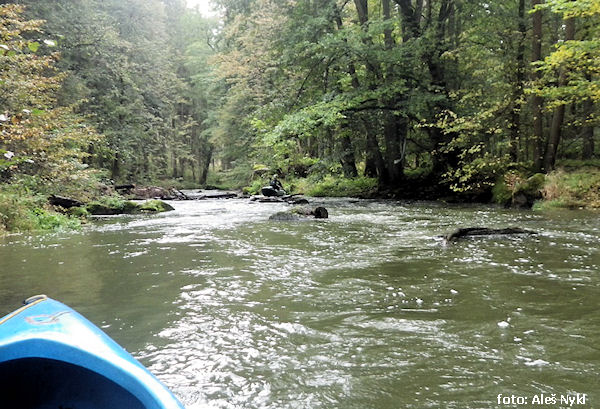 jez přenést vľavo nebo vpravo vysoký (m) 0,6 sjazdné !! následuje pěkný peřejnatý úsek až k soutoku se Skalicí 2,2 km (GPS: 49.4164058,14.1224578) |