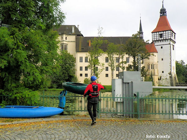 most cestný Blatná vľavo, Hotel (pension) restaurace bufet zdravotná pomoc pošta kaplnka kostol vľavo, vlaková zastávka Blatná 300 m vľavo, obvyklý začiatok plavby, 0,5 km (GPS: 49.4284833,13.8707575) |