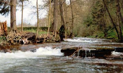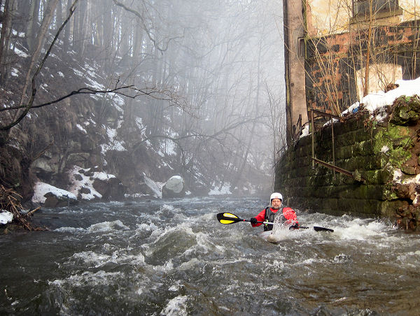 most pešej nebo lávka Luisino údolí vľavo, Hotel (pension) vľavo, přítok vľavo Husí potok obvyklý začiatok plavby, WW IV a nasleduje za vysoké zdi, obtížné přistání !! 0,8 km |
