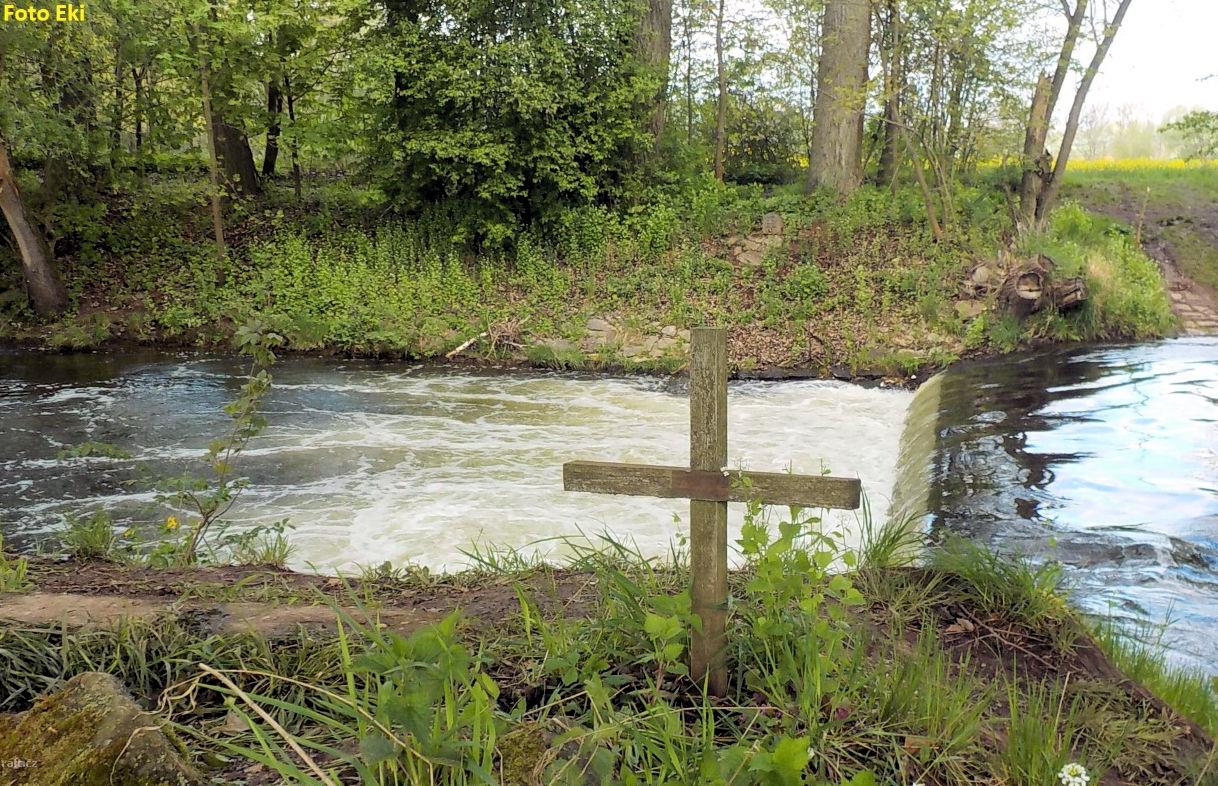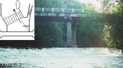 Pozor v Úpici, kde se opravuje most. Lešení zasahuje do toku v celé šířce, ční tam roxory proti vodě ...