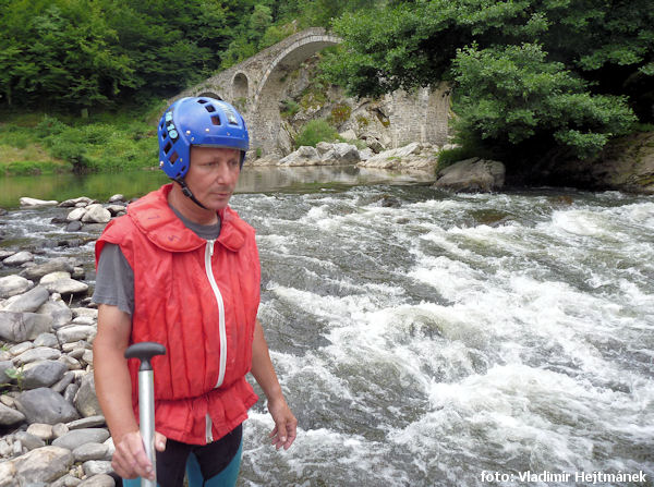 Arda teče ve zhruba pětatřicetikilometrovém divokém údolí, které je přístupné jen na jednom místě – něco za polovinou toku u Ďábelského mostu, což je úžasná stavba z 15. století. Plavbu máme plánovanou na dva dny s tím, že u mostu přespíme. Realita (vodní stav a čas) však redukovaly splutí pouze na spodní úsek od Ďábelského mostu k přehradnímu jezeru Kardžali. Večer před splutím se rozhodujeme, že na vodu půjdou vyspělejší jezdci, a druhá část naší čtrnáctičlenné výpravy půjde horami podél Ardy pěšky. Řidič František, který kučíruje naší šestnáctku Iveco, s ní mistrně zajíždí z Ardina až k mostu. Nafukujeme pálavu, baraku a čtyřku raft, a po úlitbě (nezbytném rituálu) vyráží obě skupiny za svým cílem. Dost dobře nevíme, co nás čeká. Nevíme pořádně ani, jak dlouhá bude naše cesta. Kolíňáci, kteří Ardu jeli před dvěma léty, neměli podmínky k tomu, aby dělali podrobnější dokumentaci. Vody je dost, a první peřej pod mostem je slibná – zpěněná voda nese na kámen magneťák, který se rychle blíží. Kdo tuto peřej bezproblémově nezvládne, ať raději nejezdí dál.