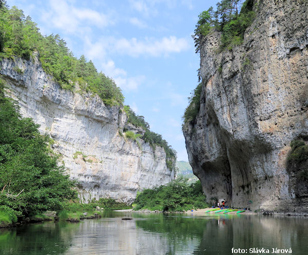 Kaňon Tarnu je též vápencový, jako byl Ardèche, ale úplně jiný. Údolí tvaru V je několikastupňové, v každém stupni jsou rozesety bílé skály a skalky v zelených loukách. Poslední stupeň tvoří skály kolem vody. Té je tu o něco míň, než bychom si přáli. Občas drhneme o dno, jednu peřej jsme museli projít pěšky, dobře, že jsme nejeli shora. Ale řeka teče rychleji než Ardèche, je to příjemná WW I, nejsou tu žádná stojatá místa a vody pomalu přibývá. Za každým zákrutem před námi prchají ryby, občas se objeví starý kamenný most, záludný kamenný blok hned pod hladinou nebo domek jak z pohádky. Ten nejhezčí míjíme v Saint-Chély-du-Tarn, vodopád prýští přímo z jeho dveří.