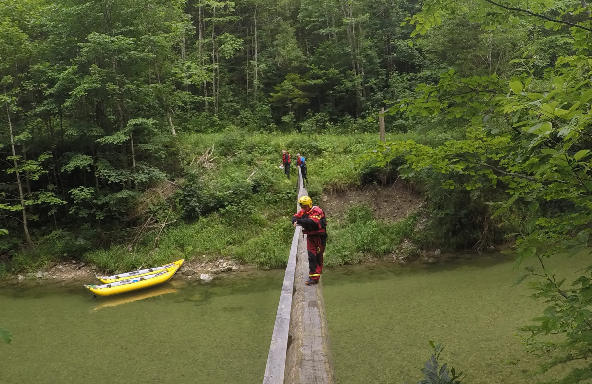 V klidnějších pasážích se rozšíří na celé koryto, aby se vzápětí znovu zúžilo. Není to nic náročného, jen je nutné dobře číst vodu. Zhruba v půlce cesty narážíme na nějakou divnou kládu přes celou řeku, která kdysi asi měla funkci lávky. Je tam udělané zábradlí a nás zajímá, co je na druhé straně.