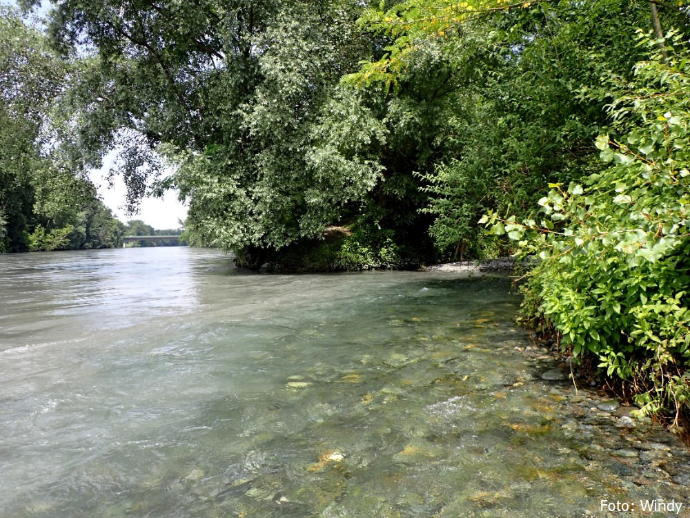 Druhý den nás čeká 22 km. Zdá se, že vody je o trochu více než předchozí odpoledne. Vyrážíme okolo desáté. Charakter řeky se nemění, rychlý proud, vysoké břehy, výhledy na okolní hory. Po necelých sedmi kilometrech dálniční most prakticky na začátku souvislé zástavby Grenoble a jeho předměstí.