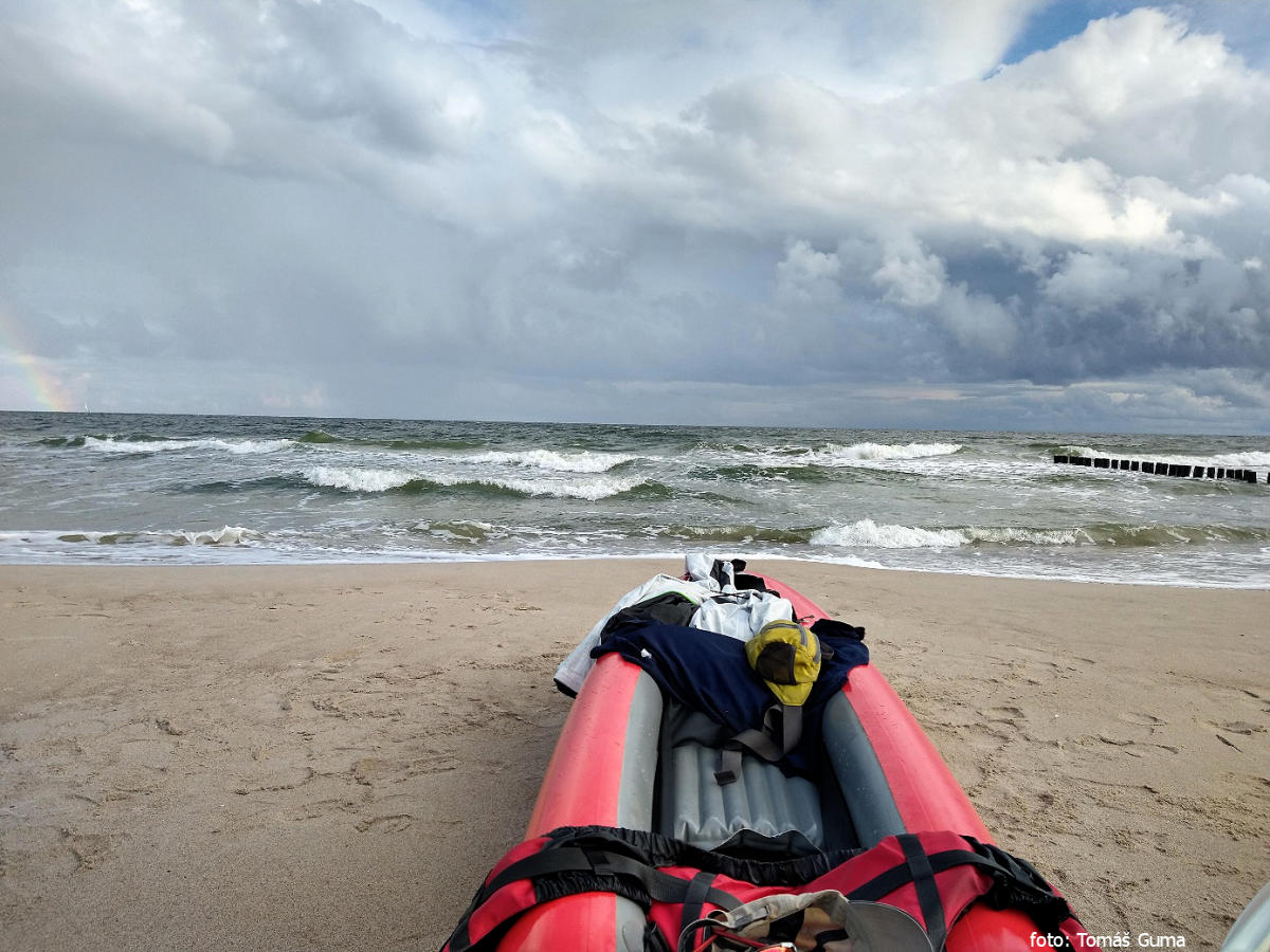 Je to jako na přechodu. Podívám se nejdřív doleva a pak doprava a když nic nejede, vydávám se přes ústí. Plavební dráha vymezená bójkama má možná 200 – 300 m na šířku, snažím se jí přeplout co nejrychleji. Vlny jsou do půl metru, Safari si s tím bez problémů poradí. Ostatně vlny byly už celý den. Za hodinu jsem na druhé straně a můžu si oddechnout. Pak následuje plavba podél pobřeží do Czarnocina. Na malé písčité pláži zastavuji. Chtěl jsem plavat ještě dále, měl jsem minimálně hodinu, než se začne stmívat, ale místní mě varují. Následuje totiž výběžek, kde volně žijí divocí koně. Prý jsou docela nevychovaní a dokáží rozkousat i pneumatiku auta. Nabízet jim stan nebo loďku na večeři nechci, tak zůstávám na místě. Je to hezké místo v borovicovém lese s lavičkama, na kterých vařím večeři. Došla mi jedna bomba, tak jsem použil novou. Zřejmě nekompatibilní. Poznal jsem to podle toho, že bomba nejprve šlehla a pak začala hořet. Místním jsem připravil menší ohňostroj. Naštěstí byl všude kolem písek, a jak známo, pískem se hasit smí. Od nynějška tedy už jen studená strava.