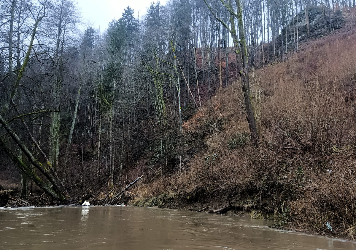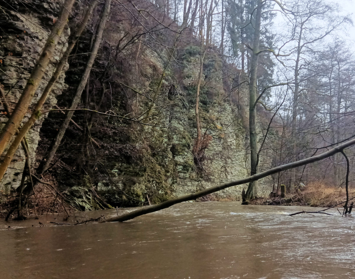 Následuje vzdutí jezu. Když ho přepádlovávám, najednou se vedle mě vynoří kormorán. Musel být pod vodou dlouhou dobu, vůbec jsem si ho nevšiml. Vystřelí jako šíp nad hladinu, roztáhne křídla a je fuč. Takto si představuji moderní střelu voda – vzduch. Jez se dá skočit nebo případně přenést. Je tam váleček, ale šikmá deska umožňuje bufnout naplocho a přejet ho. Charakter toku se nemění, stále jsou k vidění prudké lesnaté stráně s občasnými skalami.