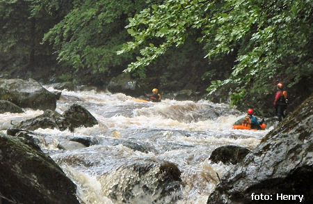 Vody je dost a tak to mydlíme dolů. Rád bych fotil, ale jako "nejlepšímu" mně nechali poslední místo. Většinou tedy není koho fotit a dost to houpe. Fotit po směru nemá smysl, protože díky spádu mi kluci zmizí za prvním šutrem. Najíždí to zpravidla Tarzan. Přede mnou jede Keny. "Keny, občas se vohlížej, jo?" "Však mě znáš." "No právě." Tarzan vymetá všechny vracáky, a že jich moc není. Skupina občasně zastavuje. Nebo taky ne a na 2x to najíždím skupině. Jsou to jenom 3 km a za pár minut jsme dole.