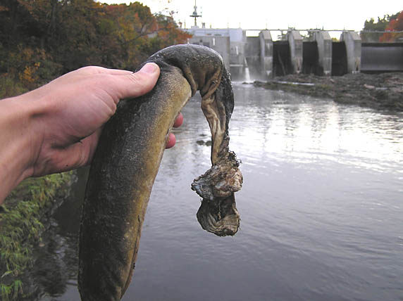 Tělo úhoře říčního, který uhynul na následky zranění způsobené turbínou vodní elektrárny