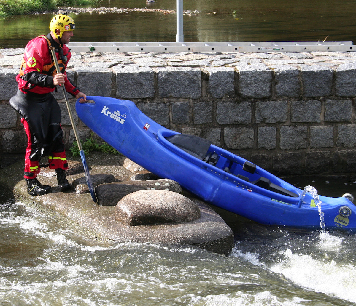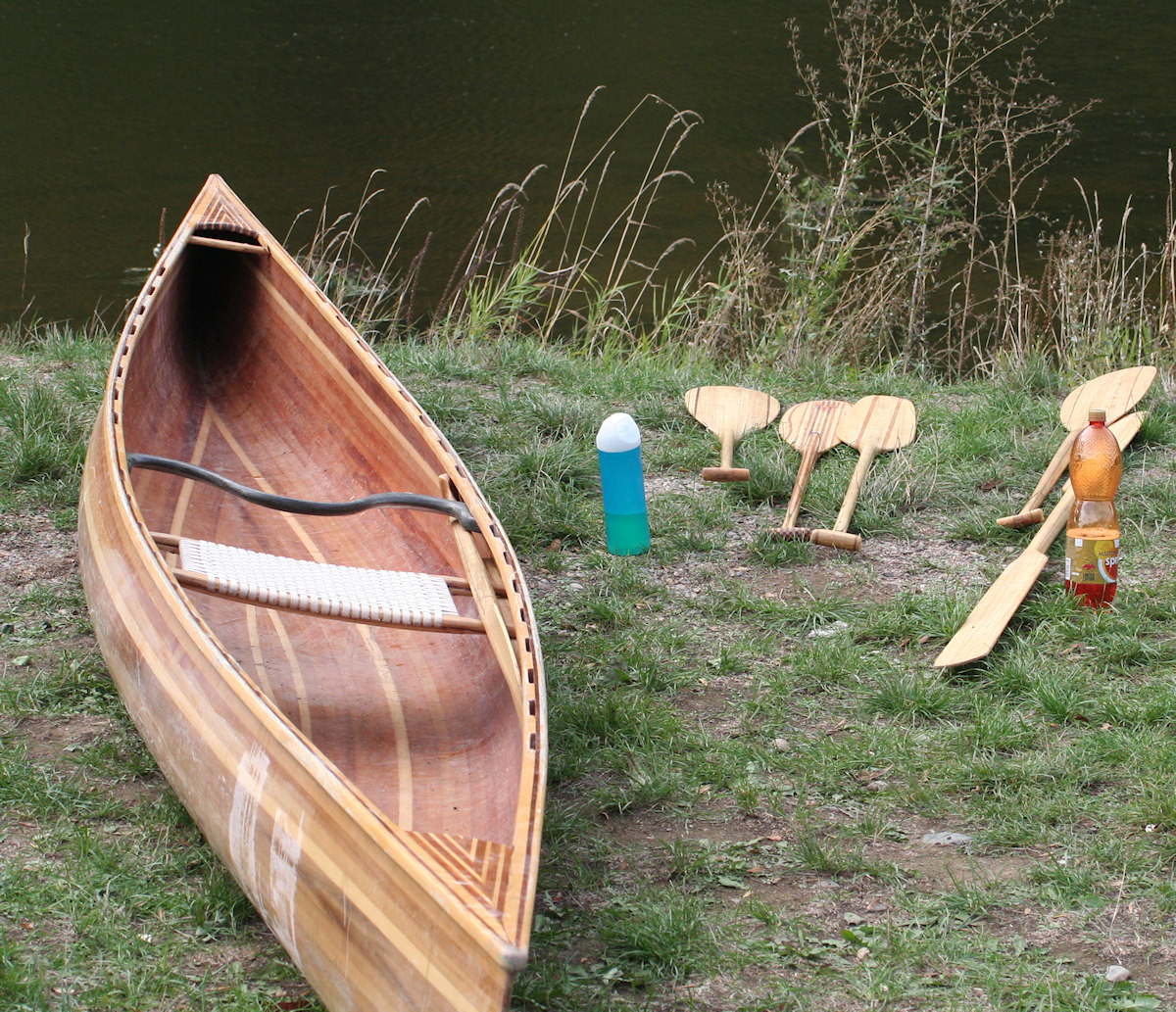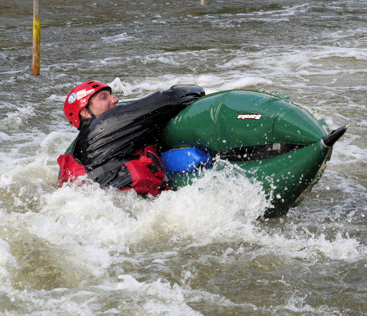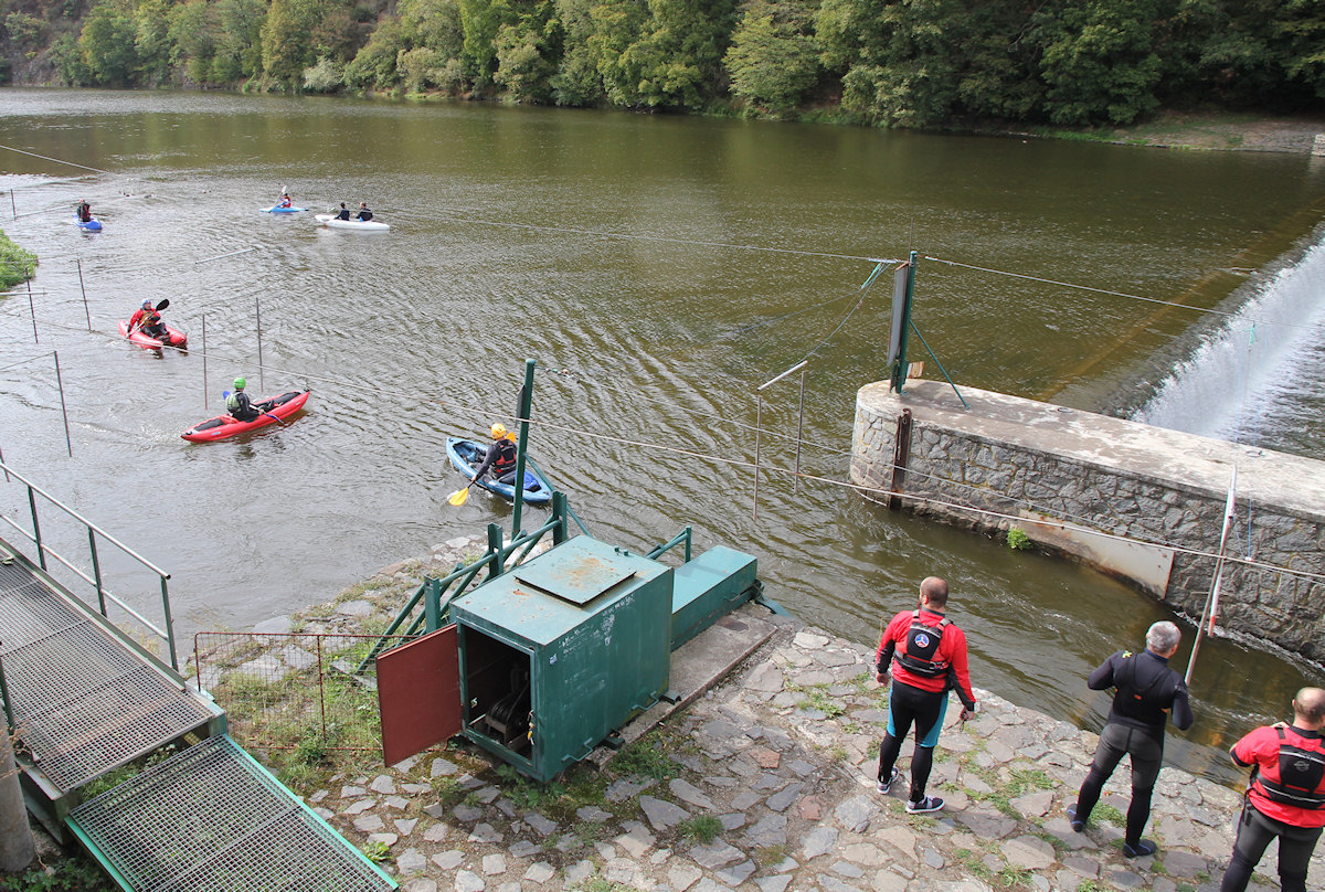 Asi 15 plavidel obvykle různých typů se pokoušelo užít si divoké vody a některá z nich byla hodně kuriózní. Já jsem nejprve vyzkoušel Chobotničákovu cedrovou lodičku, ale jen na vzdutí jezu. Její dřevěná konstrukce vypadá velmi pěkně, a když k tomu přidáme i stylové dřevěné pádlo, je to úžasný pocit. Loď jede pěkně rychle, ale nesmí moc foukat. Jakmile se mi opřel vítr do boku lehké lodě, už to bylo hodně znát.