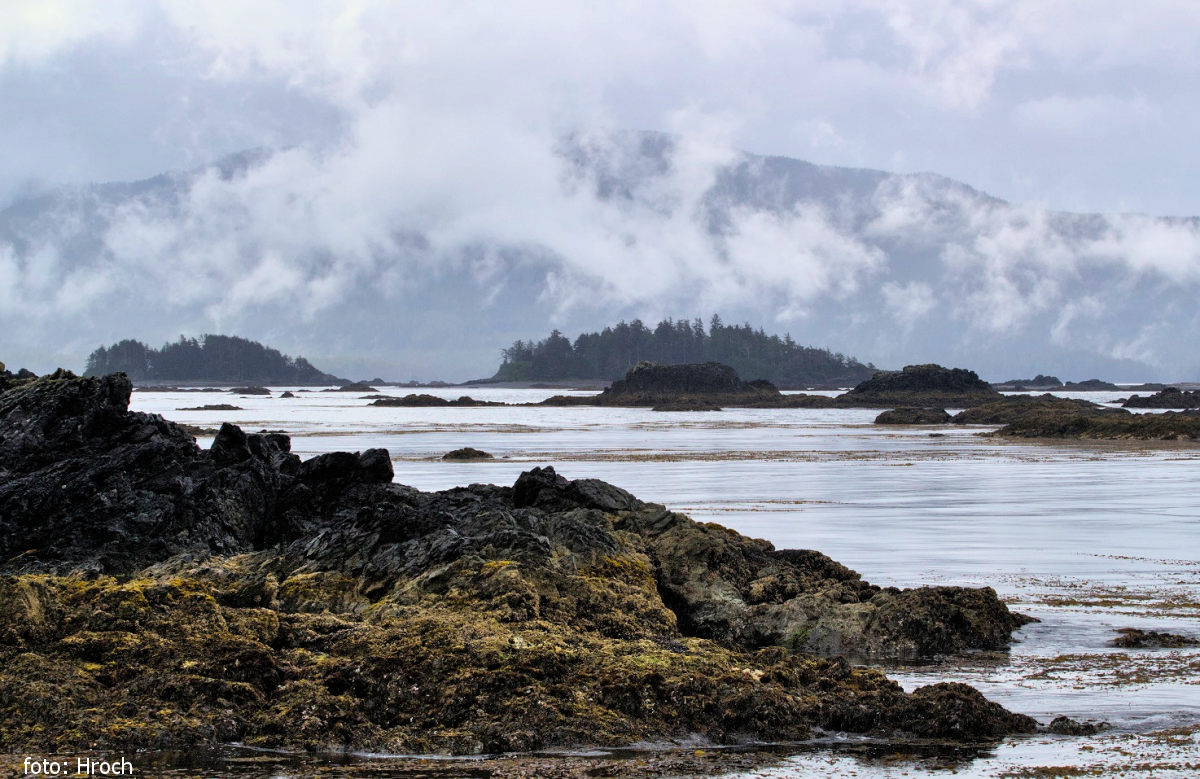 Na první tábořiště u mysu Garden Point jsme tedy dorazili vodním taxíkem v pátek kolem 5 večer za odlivu a krásného počasí. Malebné pláže s valounky a hrubým pískem, čistá říčka, v lese kolibříci a orli, v moři mořské vydry. Na jednom z několika ostrůvků jsme si ustlali na pasece porostlé jahodím s výhledem na moře a těšili se na první den pádlování. V sobotu jsme se pak již za deště vypravili na zahřívací úsek asi 10 km na ostrov číslo 40 v parku Nuchatlitz. Cestou nás sledovala skupinka zvědavých tuleňů a okukovaly mořské vydry. Na ostrov jsme dorazili za deště a bezvětří. Cestou jsme natrefili na skupinu asi 20 vodních průvodců, kteří si zatím bez klientů užívali parku Nuchatlitz. Navigace mezi ostrůvky byla bez problémů díky spolku mořských vodních turistů BCMT – British Columbia Marine Trails. Ti za velmi mírný členský příspěvek nabízí jednak výrazné slevy v půjčovnách, jednak mají skvěle zpracovanou námořní mapu celé Britské Kolumbie ve formě webové aplikace. Ta má i možnost výřez mapy uložit pro tisk ve formátu pdf (já tiskl na osvědčený rollup vinyl, vydrželo to ohýbání a šestidenní expozici v Pacifiku s minimálním poškozením). Případně lze dotyčné pdf po poněkud krkolomné proceduře použít i pro offline (na mobilní síť tam nenarazíte) navigaci v mobilu, pokud se člověk ,ztratí’ nebo chce dále na moře.