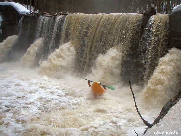 Za jednou takovou je most se stupněm s kratičkým válečkem, což nám oznamuje dotek civilizace a další chatovou osadu Úbočí pod Hasištejnem. Tady je také potenciálně nebezpečné místo, což vlastní hlavou ověřuji. Projíždím příliš pomalu pravotočivou zatáčku, za kterou se tvoří válec, který mě zastavuje, stáčí bokem a už v něm sedím. Daří se mi z něj vycouvat, ale tak deset metrů po proudu je stupeň s válcem, což by nebyl takový problém, kdyby nad hranou nebyla lávka tak pětačtyřicet čísel nad vodou. Srovnávám loď a skláním se buď málo, nebo pozdě, to vyjde nastejno. Následuje rána do hlavy, což mi staví loď na hranu a do válce vjíždím na pravém boku za svitu asi třináctiset patnácti hvězd. Rozháním je mávnutím pádla, abych se srovnal, a vytáhl z válce. Ještě se stihnu otočit a dívám se, jak je na tom Dan. Ten na to šel od lesa a snížil svou světlou výšku opuštěním lodi v prvním válci, takže do druhého vplouvá bezpečně s lávkou asi třicet čísel nad hlavou. Než stačím zastavit, vracáky totiž jako na potvoru zmizely, ženu se přírodní šlajsnou dalších 200m. Dan už je na břehu a vylévá loď, která poslušně počkala. Po kilometru další jízdy už jsme konečně v místech, která jsme si prohlídli a napětí z nás trochu opadá. Charakter toku se nemění až k nějakému retenčnímu tělesu, kde si proud prvně oddechne, aby pod přepadem pokračoval s nezměněnou energií vstříc elektrárně. Dan je trochu nesvůj, tak přenáší a já se připravuju k bufnutí. Když jsem na hraně, nějak mi to přisaje záď, takže z bůfu je parádní skok po špičce dolů, kde mě po chvilce vypálí proud z pod jezu pryč.