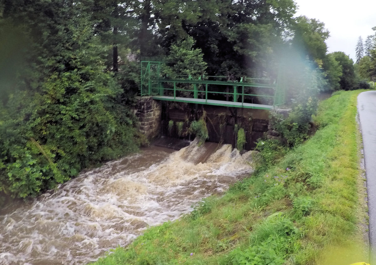 Bohužel stavidla nejsou zvednuta dostatečně vysoko, voda podtéká spodem. Výstup není úplně snadný díky šikmým břehům, zpět do vody to jde lépe. Sklouznu se ze 3 m vysokého břehu a jen si říkám, abych druhou stranou nevyjel zase na opačný břeh. Pak už jen kousek k mostu, kde přemlouvám místního pána, jestli by mě nehodil nahoru k autu.