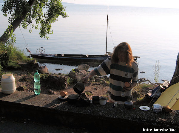 Projíždíme kolem rekreačních středisek u severozápadního břehu s tobogány, výskajícími dětmi a spoustou lidí a v klidných úsecích mimo střediska se proplítáme mezi rákosinami. Vylezli jsme si i na jeden z mnoha kovových posedů, které tu stojí pro rybáře – tady by z břehu na pořádnou rybu nedosáhli. Kdesi daleko před námi se černá tmavá hmota poloostrova Tihany a k té se pravidelnými záběry pádel pomalu a s přibývajícím večerem čím dál tím rychleji blížíme. Slunko zapadlo, vyšel měsíc a my jsme pořád ještě na vodě. Dorazili jsme až za úplné tmy a dobře tak – na břehu Balatonu není nikde žádné místo, kde se utábořit. Buď jsou tam rekreační střediska anebo rákosí, nic mezi tím. Na poloostrově Tihany jsme našli alespoň dva rovné metry mezi silnicí a vodou, rychle postavili stan a zalehli.