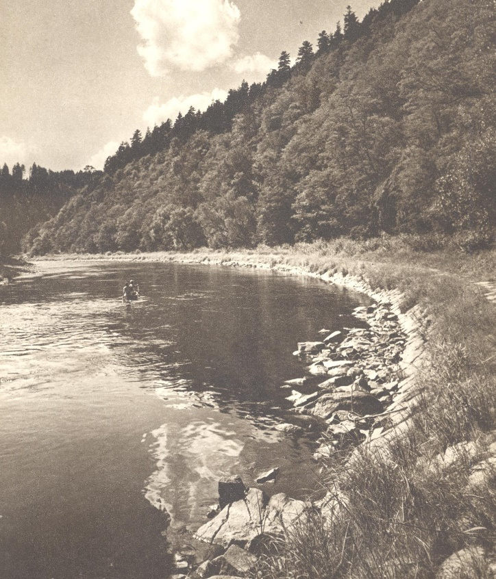 Koryto Vltavy s potahovou stezkou, dnes zatopeno (L. Sitenský: NA ŘEKU…! 1957)