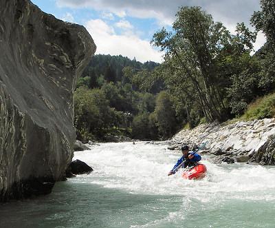 Po 500m od začátku přichází za mostem obtížnější pasáž označovaná jako Schiefes Eck a s obtížností WW IV+. Nevím, jestli to bylo povodní nebo naším stavem vody, ale úsek okolo skály byl maximálně WW III. Jednalo se jen o pěkné a celkem bezpečné vlny ve zúženém místě. Pokračujeme dále v hezkých peřejích a přibližujeme se k mostu v Pians. Už před ním to začíná být zajímavé. Peřej je obtížnější a její konec jde mezi skály, nad kterými je most. Vzhledem k tomu, že jsme si další kataraktový úsek prohlédli předem, jdeme rovnou do toho. Nejprve je náročnější peřej s několika válci hned za mostem, kde je nutné od středu rychle mezi válci přejet vpravo. Jedu jako první. Najíždím dobře a projíždím několik vln. Jenže pak nestíhám přejet na druhou stranu a tím se vyhnout poměrně velké žumpě. Balancuji na hraně kajaku a jen se štěstím nekončím ve vodě.