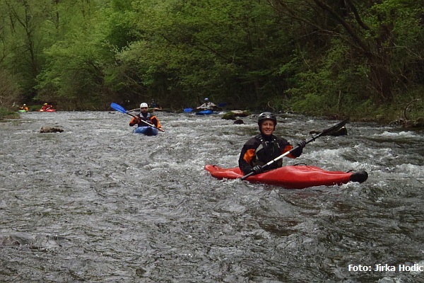 Voda je docela čistá, nazelenalá a většinou svižně teče, někdy i přes lehkou peřejku nebo trochu táhne v zatáčce pod podemletou skálu. Občas se vyhýbáme ojedinělým balvanům a jednou přenášíme padlý strom. Obtížnost se pohybuje okolo WW I, pár míst je nepatrně těžších.