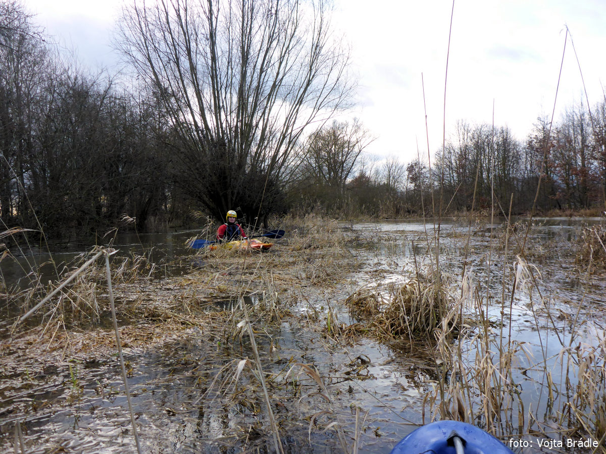S tím, jak jsme se vzdalovali od Smržova, se potok viditelně rozšiřoval. Ve chvíli, kdy jsme dorazili na úroveň biocentra Obora poblíž Smiřic, činila jeho šířka už kolem 20 metrů. Zatopil totiž své bezprostřední okolí. V téhle části jsme se museli potýkat s větším množstvím větví, keřů a stromů stojících ve vodě, ale díky šířce toku se kolem nich dalo porůznu proplétat.