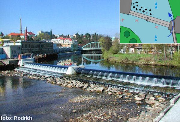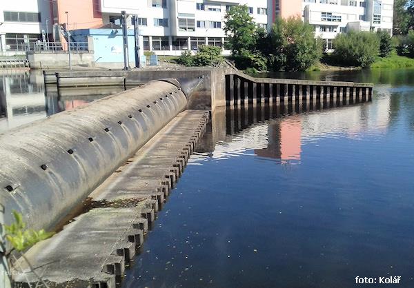 r.km 79,5 Jez Turnov má na pravé straně rybí přechod, po roštech nad ním lze přenést loď, 11/2023