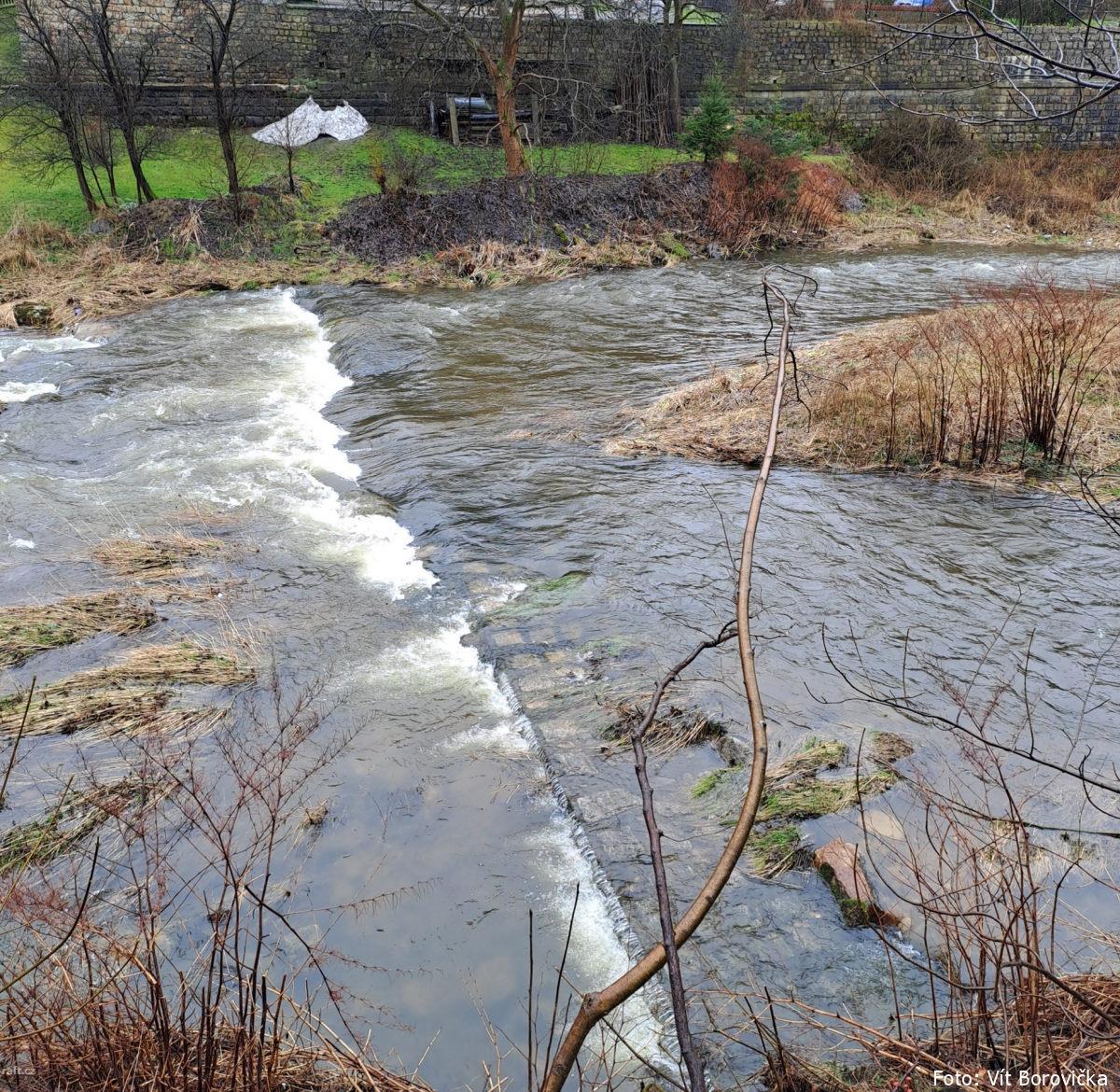 20.2.2023 Držkovské skoky, strom přes řeku 50m nad peřejemi v úrovni hladiny, za vetší vody jde pžez ...