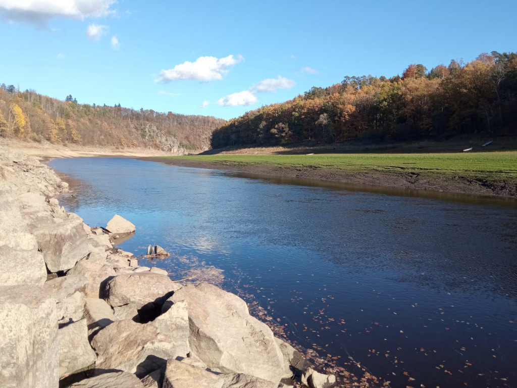 hrádza přepadu vľavo a nasleduje za 50 m jez (stupeň) sjazdné cvičná peřej 150 m 0,6 km (GPS: 49.258107453,13.881772757) (GPS: 49.2580933,13.8818108) |