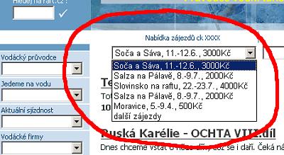 U každé řeky, kde bude zapsán Váš zájezd, se zobrazí v menu položka zájezdy. Po kliknutí na odkaz se zobrazí výše uvedené informace o zájezdech. Tím dojde pro návštěvníky stránek k velkému zjednodušení, protože potencionální zákazník nemusí hledat na několika různých serverech požadované informace, ale ihned vidí vše potřebné navíc u řeky, kterou si chce sjet. Po kliknutí na příslušný zájezd bude přesměrován na Vaše stránky, kde si o zájezdu může přečíst více.