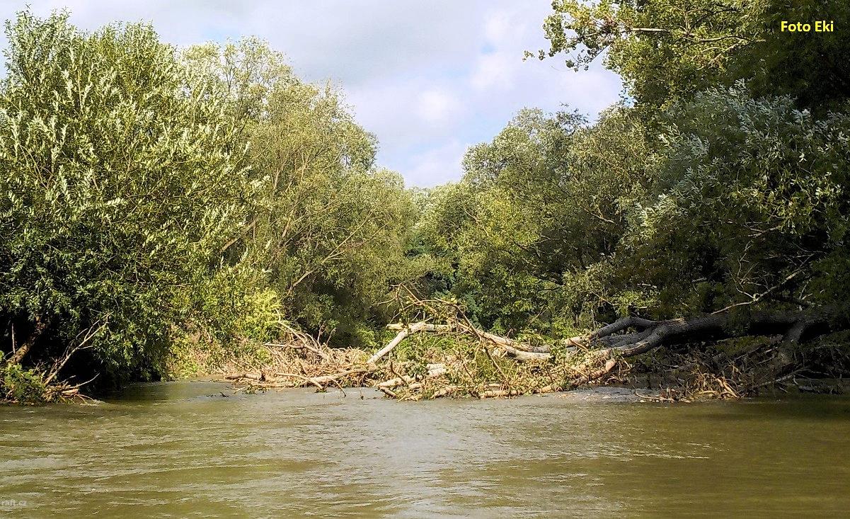 Cca 500 m pod jezem v Kunově je přes řeku natažený špatně viditelný drát - zcela bez označení (vprav ...