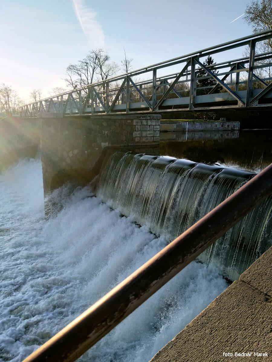 cca 74,0 ř.km v Březině za siln. mostem po vracení nahonu spadly strom přes celou řeku a