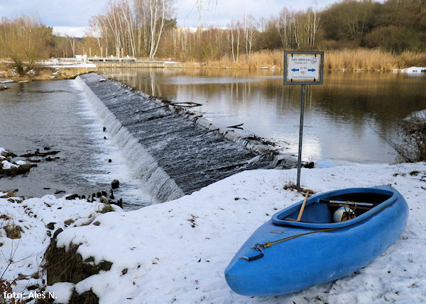Jez samotný je kolmá obluda vysoká možná 3,5 m bezpečně překonatelná jen přenesením (vzhledem ke vzdálenosti radši převezením). Vystoupit by se dalo i těsně před korunou, kde je v navigaci žebřík, jenže tahat lodě nahoru se nám tam fakt nechtělo. Cestou po nábřeží čekáme na červenou, ale po několika minutách čekání to vzdáváme, holt zelená v Plzni došla. Za mostem je opět pěkný žebřík, kde je možné lodě spustit.