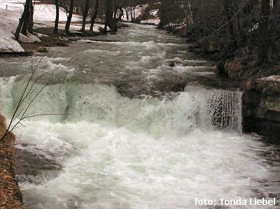 Za Papežovem se Mohelnice pozvolně rozjíždí. Sice teče z kopce (spád přes 20‰), ale nejkrásnější úsek přichází po prvním podjetí silnice. Nad ní je krásný skluz se šikmými válečky a asi po 200 m začínají první pořádné kamenné prahy. Ten první byl asi špatně deratizovaný, jelikož se tam koupu i s Gábi. Já jsem si prohlédl zajímavou skalní kapsu, kam mě vykopl válec hlavou dolů (naštěstí vody po pás), zatímco Gábi předvádí zajímavou prostnou bez kajaku v následující peřejce (rozhodčí jí dali velmi vysokou známku za sestavu s hlavou pod vodou, všechny končetiny nad hladinou). „Sušte si to prádlo na šňůře někde jinde“, huláká Oskar z Opavy, když podjíždí naši házečku. To už Gábi dnes stačí a tlačí si kajak k silnici. Myslím, že to byl kolektivní nápad vylíčit Gábi Mohelnici jako WW I+. Apríl. Doufám, že se nám to podaří nějak odčinit, jelikož jezdí rok a ještě nikdy nejela lehčí než trojkovou vodu, pokud nepočítáme trénink na loděnici. Protože je jinak fakt dobrá a byla by škoda, kdyby na vodu zanevřela. Přitom, že těch krys tenhle víkend bylo a sjely se z různých měst… Ale k vodě.