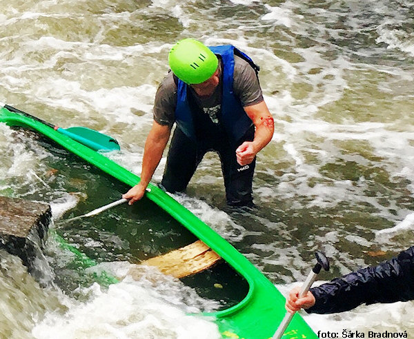 A právě jedna z nich měla hned na prvním jezu u rybářského spolku nepříjemnou nehodu. Došlo k poranění kormidelníka, který se cvaknul, praštil se na koruně jezu a odnesl to roztrženou rukou u lokte.