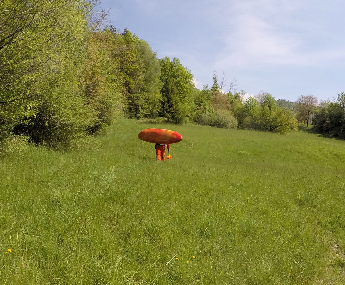 Naše druhá experimentální část má v plánu odejít po svých i s kajaky přes kopec k jednomu z nejkrásnějších jezer. U mostu nad obcí Bled zastavujeme a plánujeme náš pěší výlet. Ještě na mapách hledáme, zda-li není možnost zastavit o kousek níže, čímž si ušetříme asi 100 m nesení. Mamba už je ale na břehu a se slovy: „Hoši, kdo tam bude první,“ odchází se svým kajakem přes most. Hodí slovo s vojákem, který hlídá místní vojenskou střelnici a seznamuje ho s plánem pěšího výletu na Bled. Voják je velmi udivený, ukáže palec nahoru, uznale zabručí a popřeje dobrou cestu. Já s Hanzem přejíždíme kousek níže na levý břeh, ale než se na něho dostaneme, chvilku to trvá. Ve stoupání po louce stačíme ještě obdivovat rostoucí lilie.