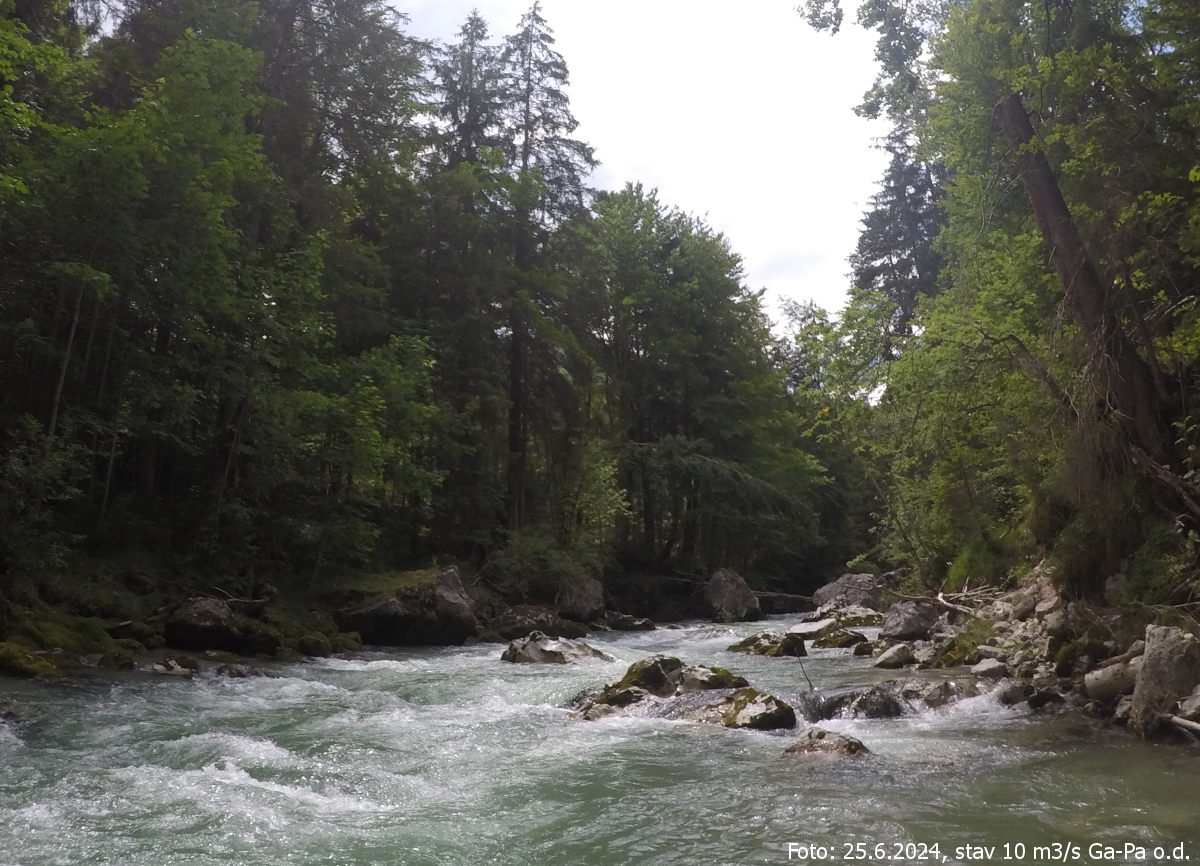 Byli jsme už dopředu varováni od jiných vodáků na parkovišti, že hned v úvodu za prvním velkým kamenem je strom, který se dá vlevo objet. Na něho brzo narazíme a jen s obtížemi se pod jeho větvemi proplétáme, protože jsme nestihli zajet úplně doleva. Další strom následuje vzápětí, ale je za našeho stavu dostatečně vysoko. Dále už je to vše čisté, ale přeci jenom jeden nikdy neví. Za velké kameny není mnohdy vidět, a tak najíždíme často přes pomocné vracáky, abychom alespoň nějak prohlédli.