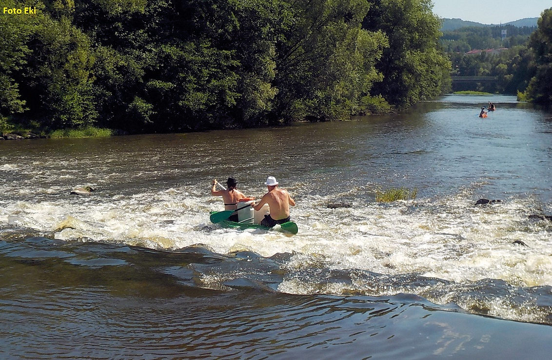 Předjíždím rafty se zvukovými aparaturami. Jeden ze splouvačů, jehož kamarádi močí do řeky opodál, se mnou zapřádá rozhovor. Typická je první otázka: „Odkud jsi?“. Moje odpověď ho nepotěší. Reaguje citátem z jakési reklamy: „To nevadí“. Předsudky jsou docela zábavné, dokud vás nezačnou lynčovat. Když na další otázku: „Kam dneska pluješ?“ řeknu: „Za Vary,“ nechává mě jako nebezpečného šílence na pokoji.