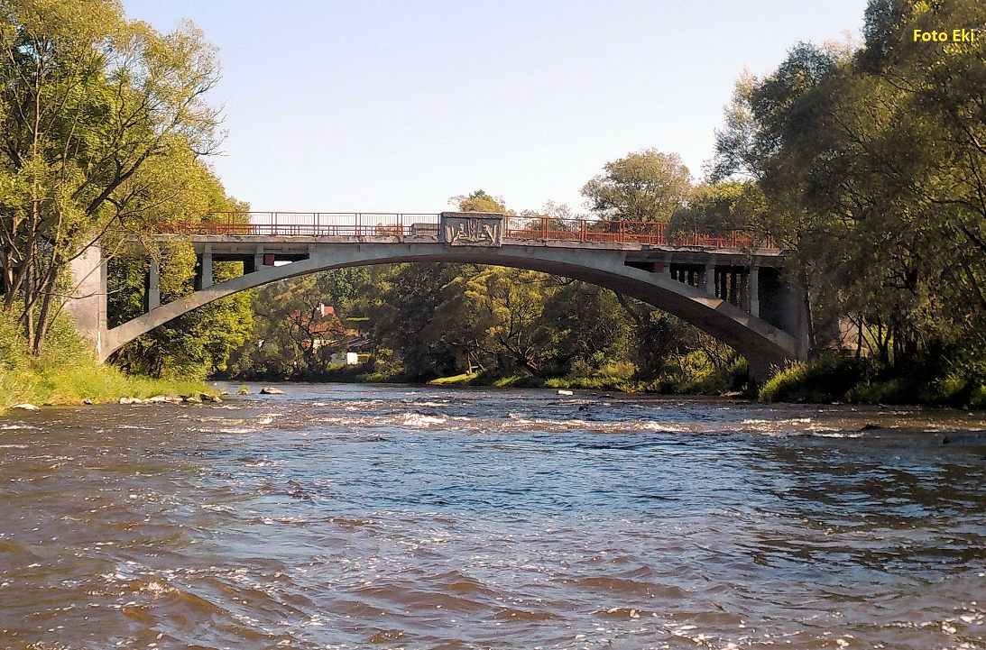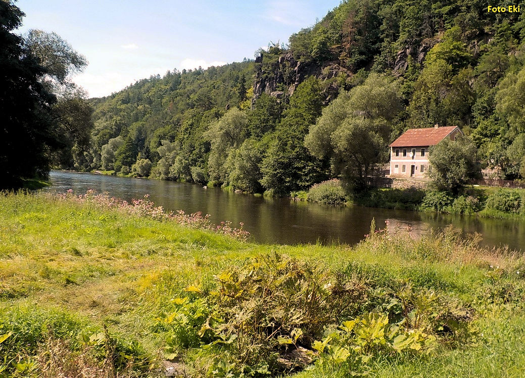 Voda se rozeběhne. Mojí keňu však zastaví peřej pod železničním mostem, aktuálních 2,3 kubíku z nádrže Skalka tu na splutí evidentně nestačí. No což, je teplo, projdu se vodou. Civilizace mizí. Dlouhý volej nad druhým jezem plavbu umožňuje.