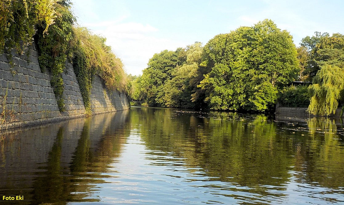 Jez překonávám levostranným kanálem, na kterém leží vyšší stupeň. Lakušníky a další vodní rostliny se vlní v proudu. Pod Kyšperkem zaznamenávám ztroskotání první plastovky.