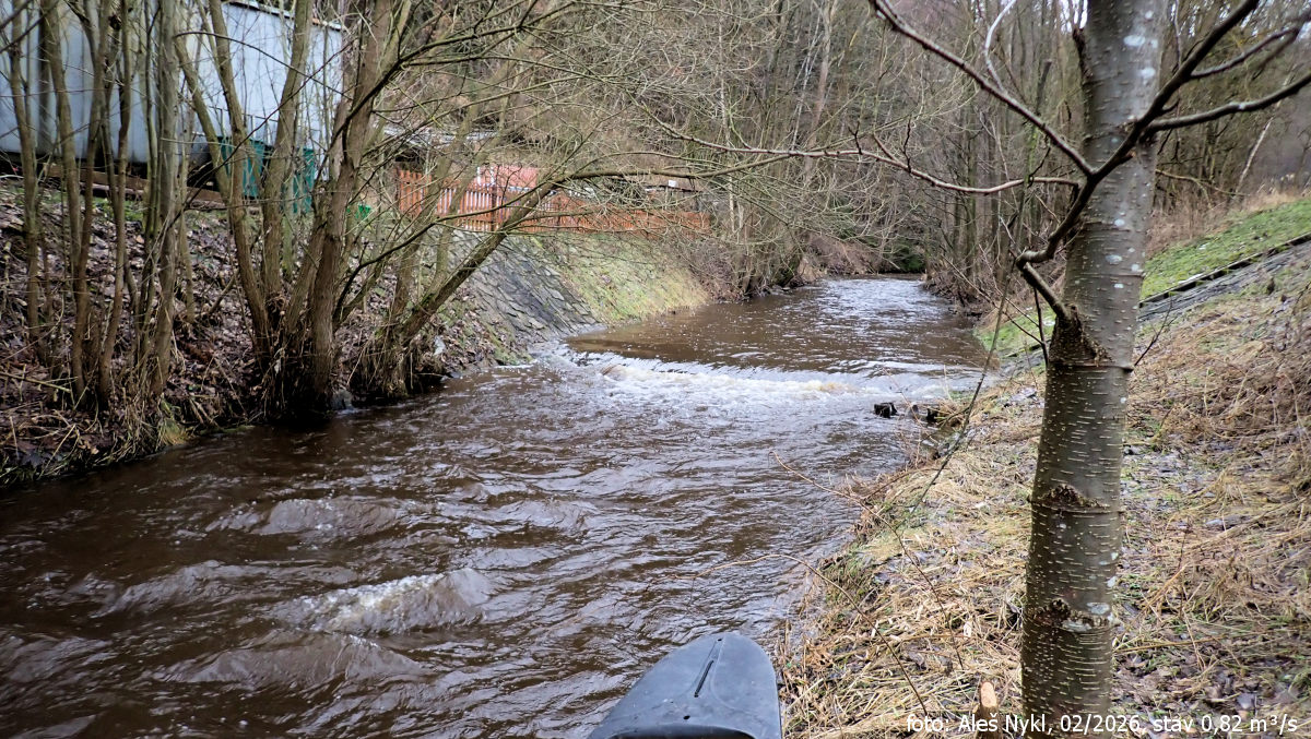 Jsou tři hodiny odpoledne, únorové dny ještě nejsou moc dlouhé, a i když mám s sebou slušnou čelovku, raději si dáváme jen kratší úsek. Začínáme v obci Libavské Údolí u mostu nad továrnou. Místní vodočet ukazuje 0,82 m³/s. To je trochu zklamání – čekali jsme víc, ale holt Slavkovský les, ze kterého teče, nemá takovou nadmořskou výšku jako Krušky. A sněhu už tam asi také není tolik.