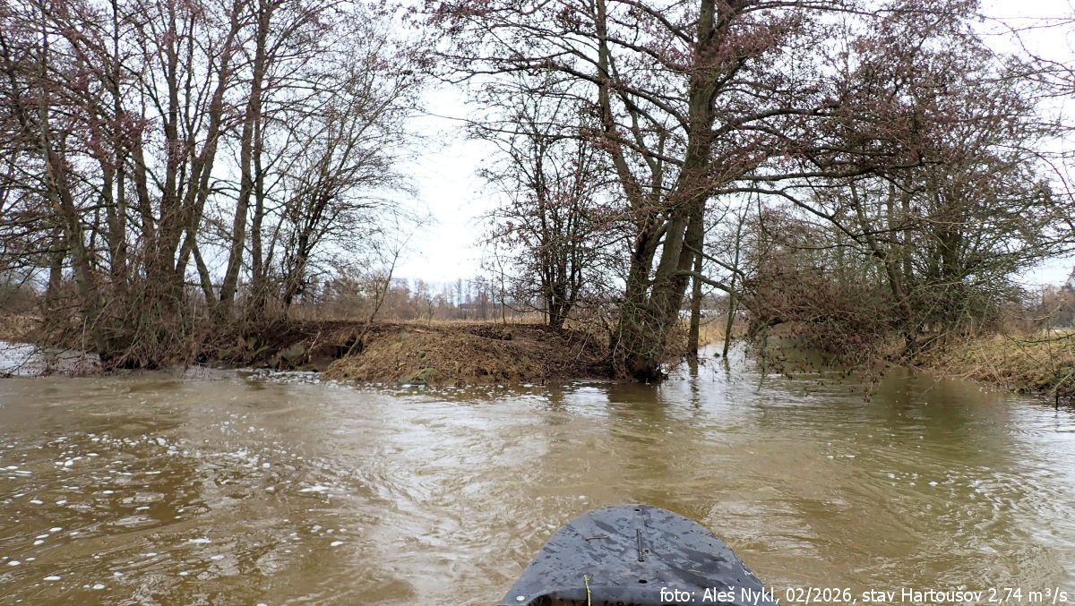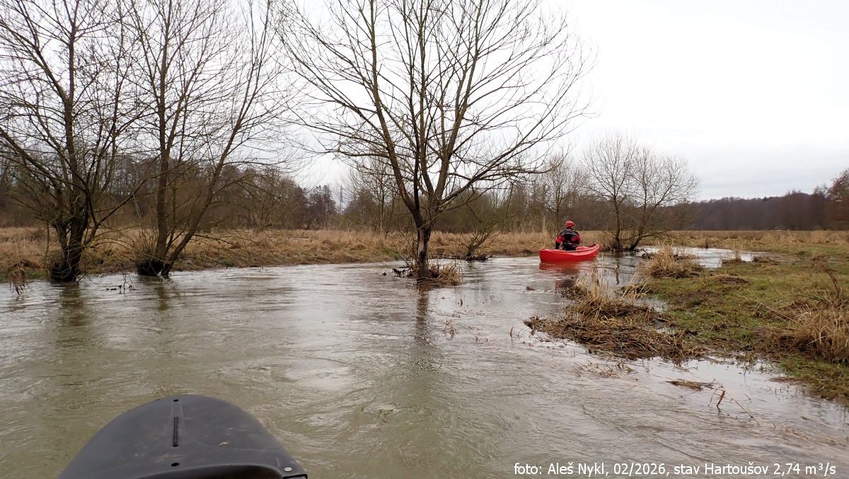 Začali jsme na Plesné. Na této říčce jsme byli už před dvěma lety. Tenkrát jsme si dali jen poslední cca 3 km úsek do Ohře a řekli si, že se rozhodně chceme vrátit. Dnes jsme na vodu vyrazili v Milhostově, cca uprostřed NPP Bublák a niva Plesné. Vodočet v Hartoušově ukazuje 2,74 m³/s. Koryto je plné, místy se voda lehce rozlévá do okolních luk.